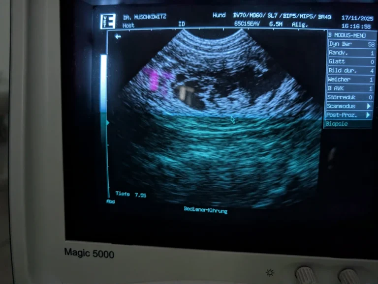 Neben aller Standard-Untersuchungen wie Zytologie, Progesteron, bakterieller Untersuchung und Co probierten wir etwas für uns Neues. Nach einigen Tagen der Läufigkeit prüfte die Klinik mittels Ultraschall, ob sich überhaupt Folikel eingenistet haben – hatten Sie – also ab nach Tschechien!